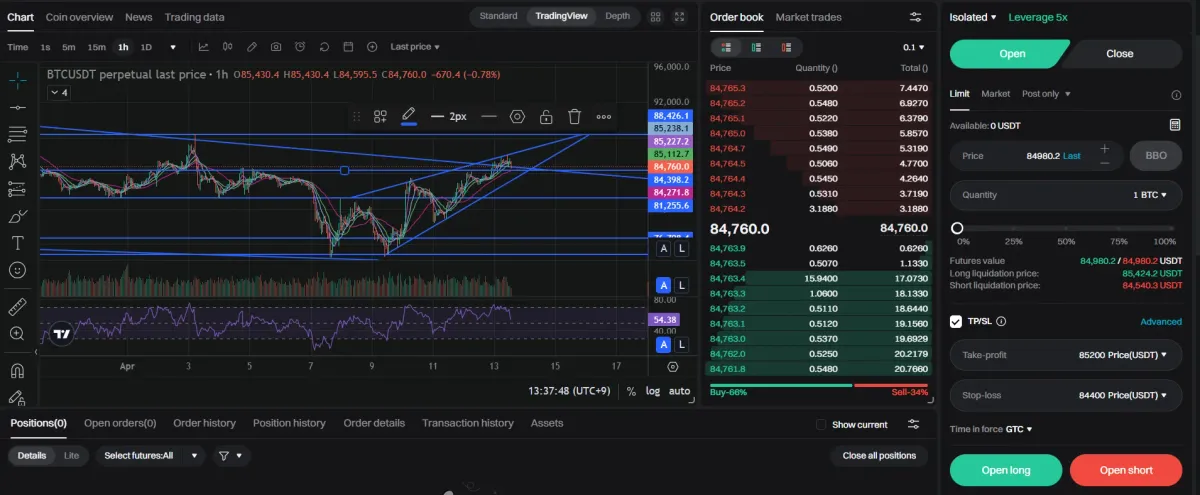 현재 BTC/USDT 자리가 상승 쐐기형 패턴이어서 조만간 하락이 예상됩니다만,