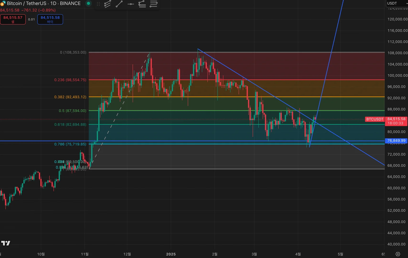 가로선과 1시간봉으로 상승추세선 일봉으로 하락 추세선을 그려보았습니다.