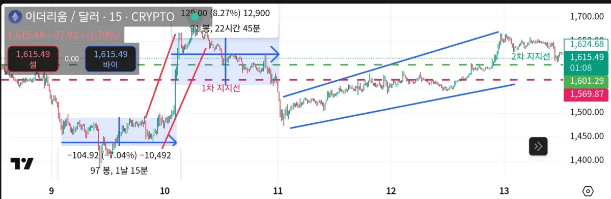 앞서 두개의 박스권으로 가격대가 형성되서 지지선을 따라 횡보하는 모습을 관찰할 수 있습니다. 상승 추세로 이어진 후 두번째 박스권에서 하락 뒤로는 꾸준한 상승추세를 이어가다가 1차 지지선이 형성되는게 보입니다. 이를 통해서 다시 상승을 볼 수 있다고 보입니다.