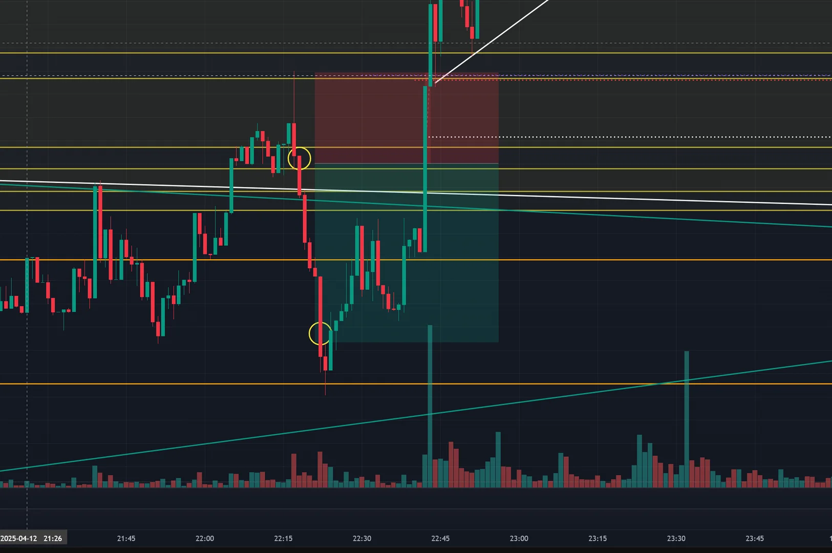 작은 더블탑이 보이고 이것의 넥라인을 돌파하는 느낌이 드는 자리에서 진입하고 손익비는 1:2 정도로 생각했습니다.