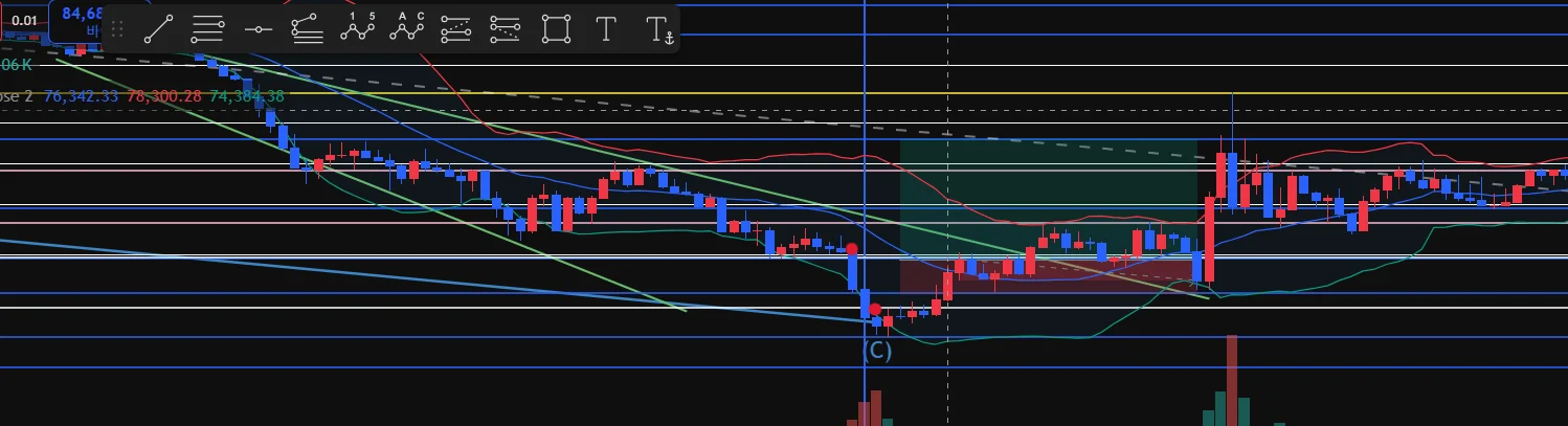 손익비를 짤 때 위쪽 저가 그린 저항선이기도 하고 볼린저 밴드 상단 쪽이여서 익절 구간을 이렇게 잡았고