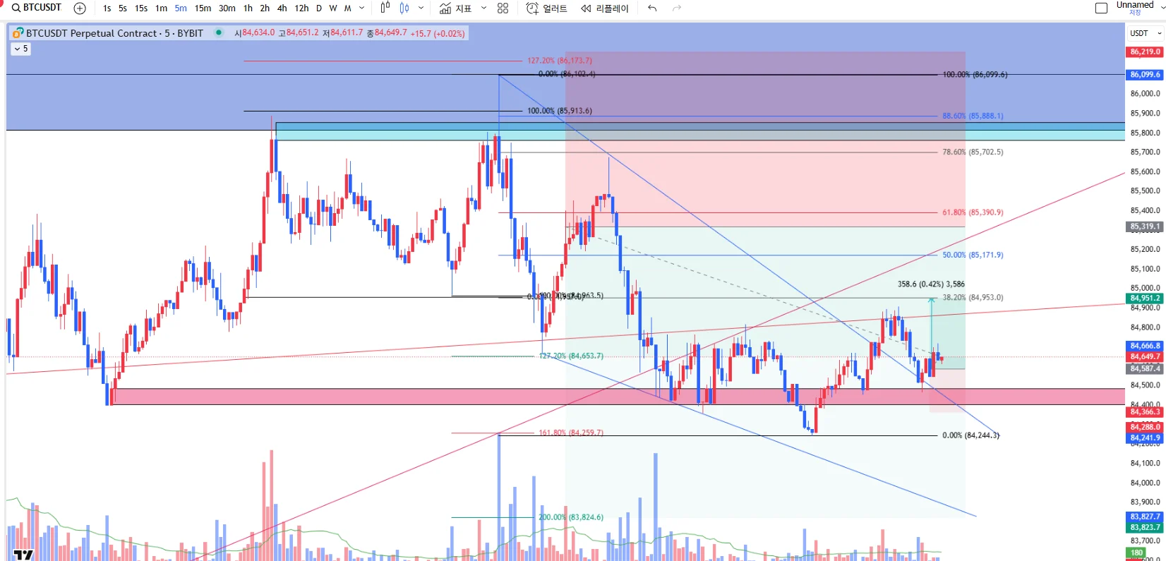 더블탑 고점에서 84250부근까지 도달 후 되돌림을 주는 중이라면 최소 38.2까지는 되돌려주지 않을까 라는 생각이 들었습니다.
