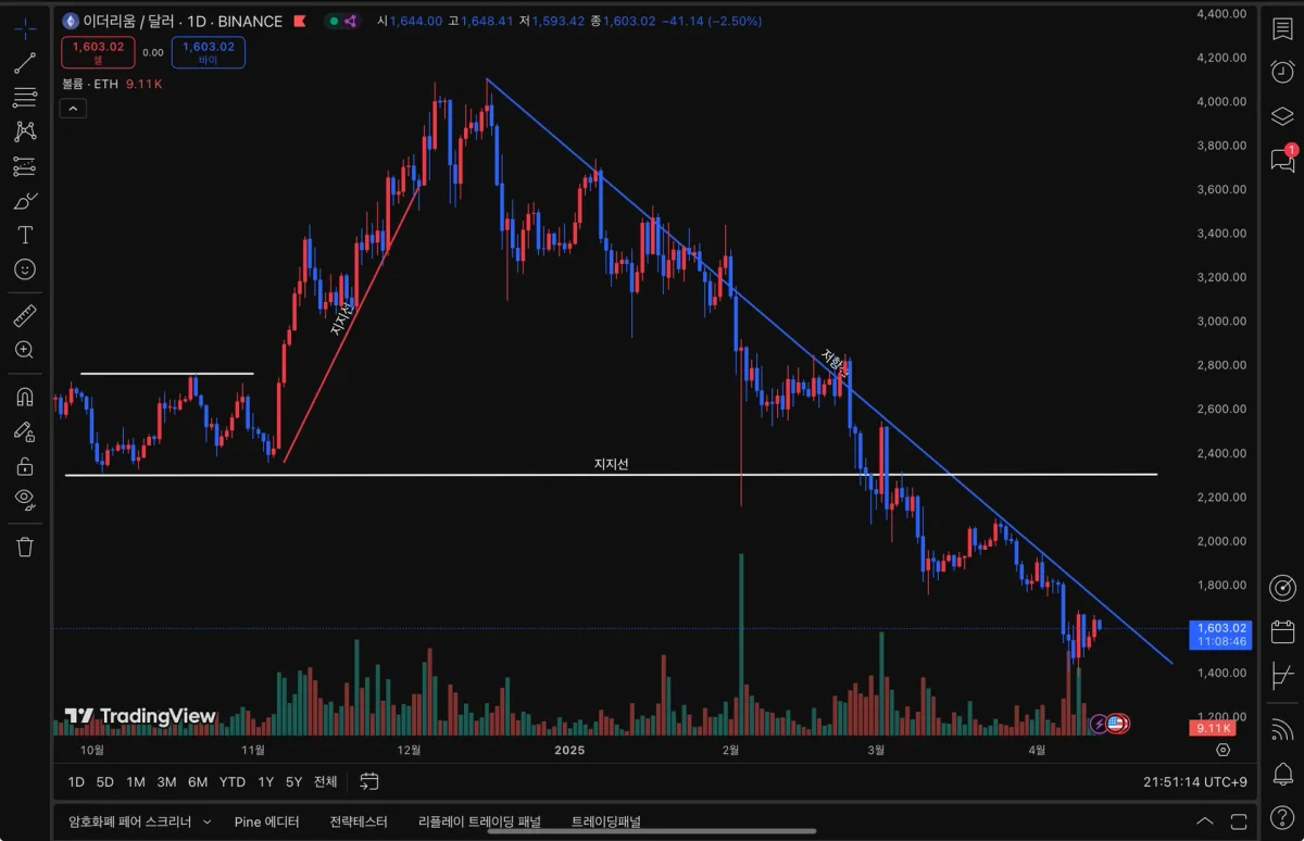 이더리움을 분석해보았습니다. 작년 10월부터 11월까지 횡보하는 모습을 보이다가 지지선을 타고 상승추세를 보입니다.