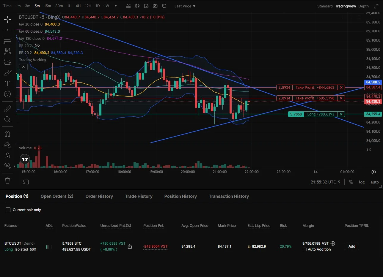 수익률만 어떻게 올리는지 못해서 이렇게 올립니다. 데모 트레이딩이라 추세선 볼린저 밴드 하단 지지에서 올라가는거 같아 롱으로 잡아 보았습니다.