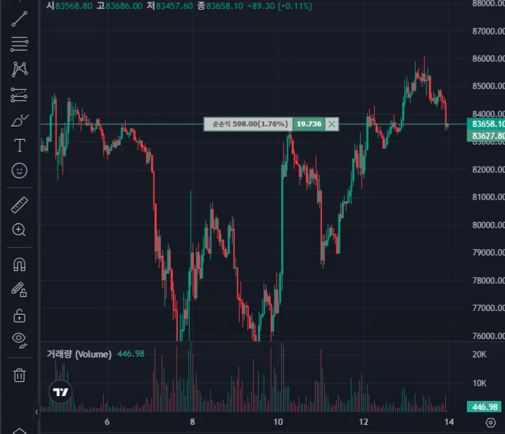 미리 2달전부터 그어놓고 기억해두었던 추세선 지지중 롱 포지션 제진입 스탑 82760