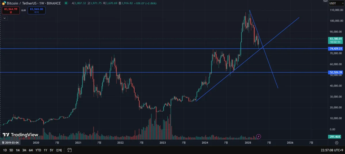 비트코인은 단기적으로 하락 추세선이 저항라인을 형성하고 있으나 7만4천달러 위로 지지를 해주는 모습을 보이고 있는 것 같습니다.
