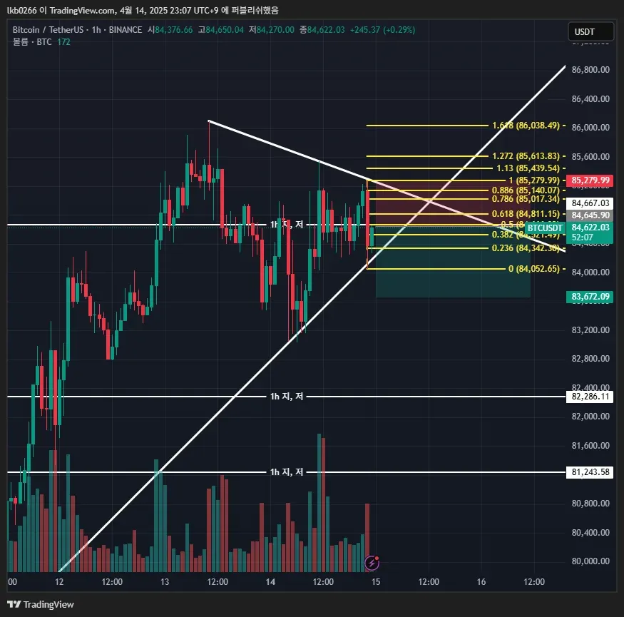 1차 : 84,550 1h지, 저와 피보나치 0.5 겹침