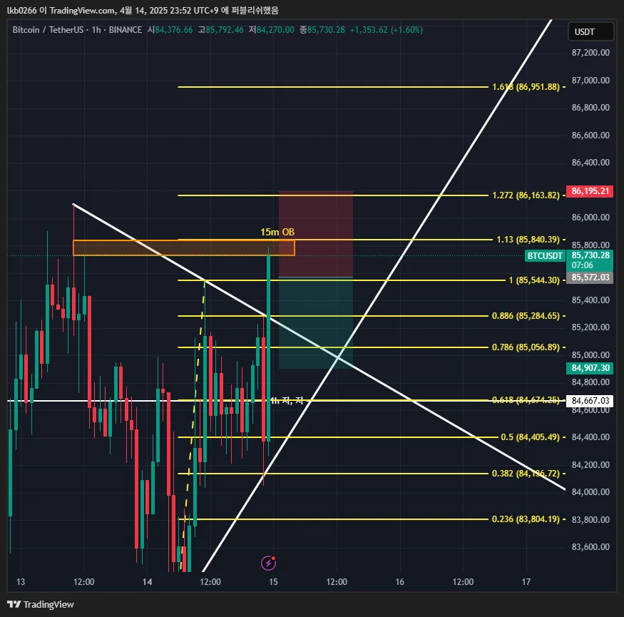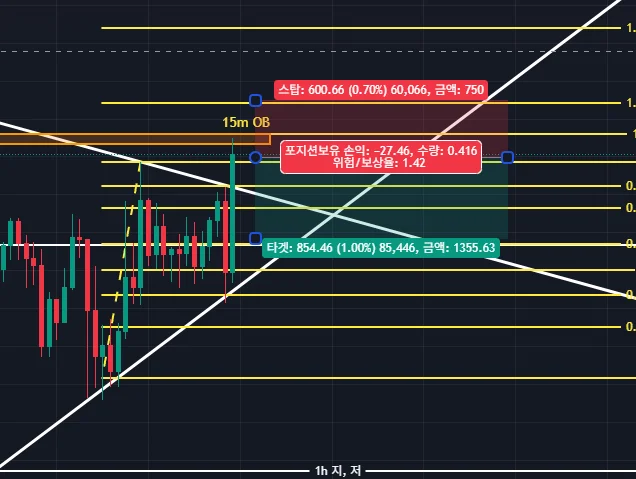 복기: 다행히 SL 안 오고 바로 내려왔네요. 또한 1h 지지선 맞고 단기 가격 거부 반응도 있었구요. 이번엔 좀 잘 잡은 것 같습니다.