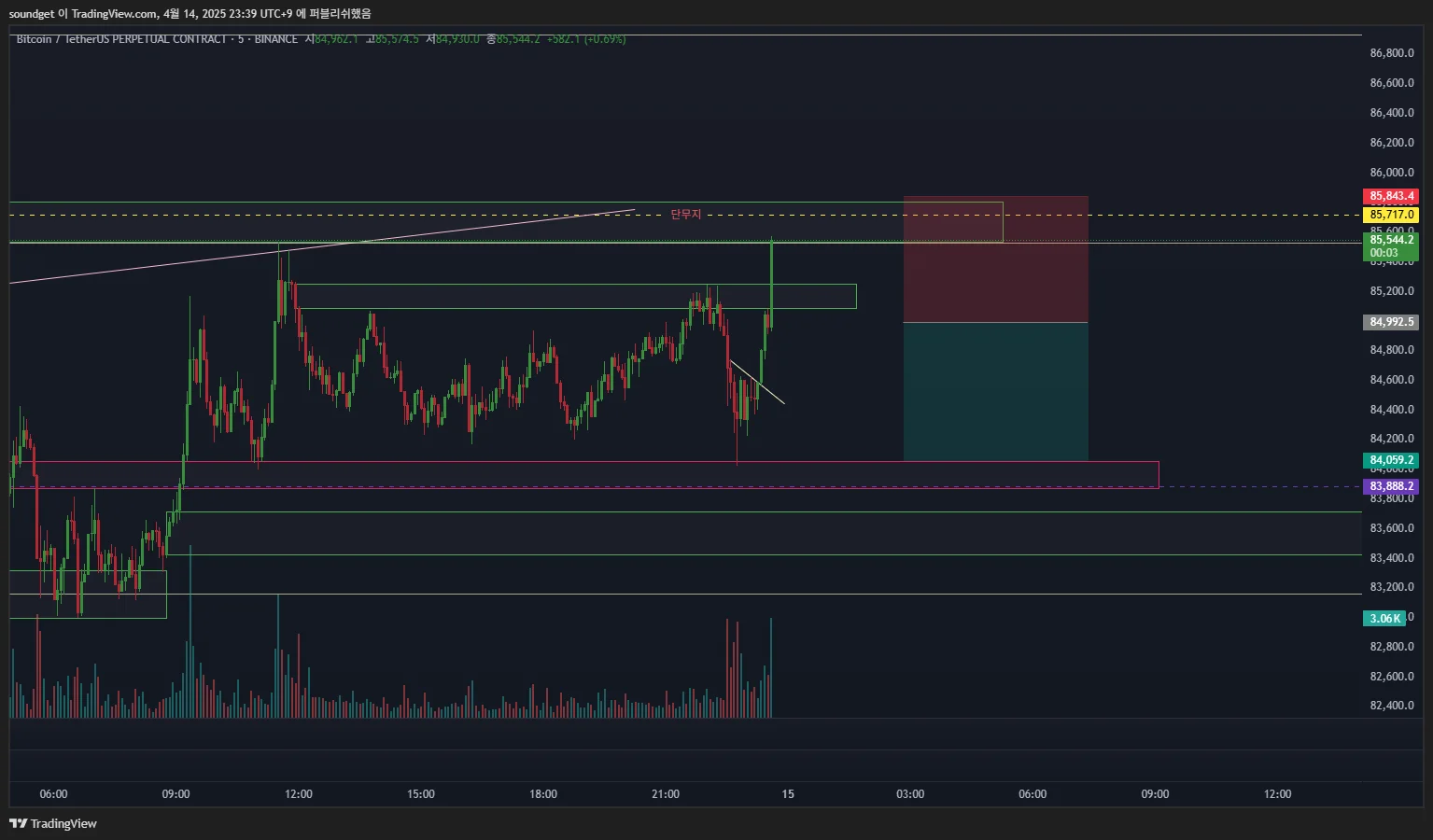 진입:84992.5/스탑:85843.4/익절:84176.57 /손익비 1:1.5였지만 스탑을 길게 잡으려고 더 늘림 현재 1.1