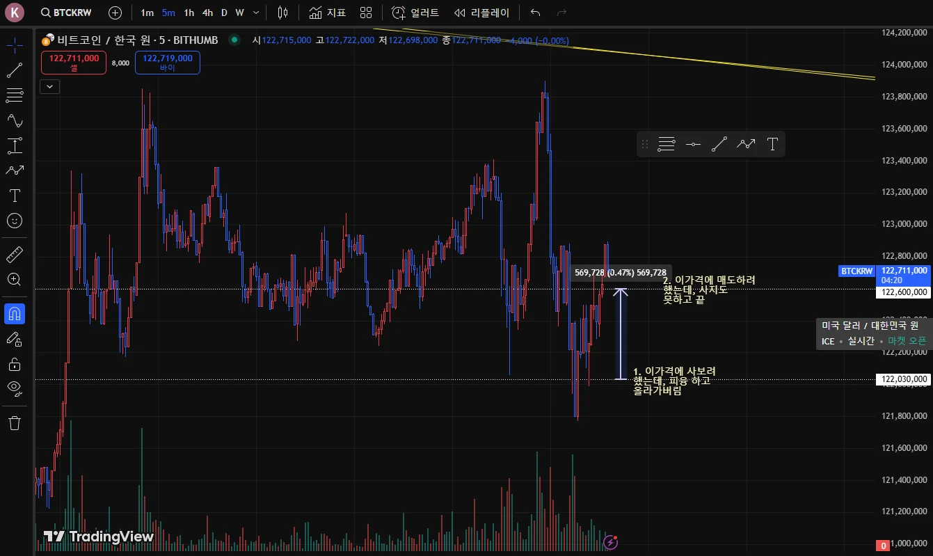 1시간 봉만으로는 매매 기회가 적어서 훈련이 부족해질 수 있는 건 맞습니다. 그래서 훈련 단계에서는 5분봉, 15분봉, 1시간봉을 동시에 병행하는 방식으로 가시는 걸 권합니다. 지금 올려주신 차트처럼 5분봉에서 흐름을 보면, 단기적으로 고점-고점, 저점-저점을 연결해서 추세선을 그릴 수 있고, 거래량이 실린 지점이나 자주 반응한 가격대를 중심으로 지지와 저항 구간을 표시할 수 있습니다. 예를 들어 차트에서 표시한 구간도 전형적인 단기 반등 후 매도세가 다시 유입되는 전형적인 저항 구간입니다. 5분봉에서는 너무 짧게 끊으려 하지 말고, 구조가 확실히 형성된 후 진입하는 습관을 들이셔야 합니다. 그리고 가능하면 1시간 봉의 구조 속에서 5분봉 진입의 타당성을 찾는 식으로, 상위 시간봉에서 하위 시간봉으로 흐름을 해석하는 훈련을 반복하시길 추천드립니다. 매일 훈련 후에 매매 일지를 간단히라도 기록해보시면 훨씬 더 효과가 있습니다.
