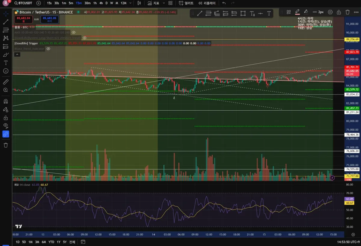 보조지표를 켜면, 이런식으로 나오는데 차트도 찌그러져있고, 진입 포지션도 제대로 나오지 않아요. 시스템 롱/숏 지표는 4시간봉 차트에서만 정상 작동되고 다른시간대 차트에서는 다 왜곡되어서 나와요