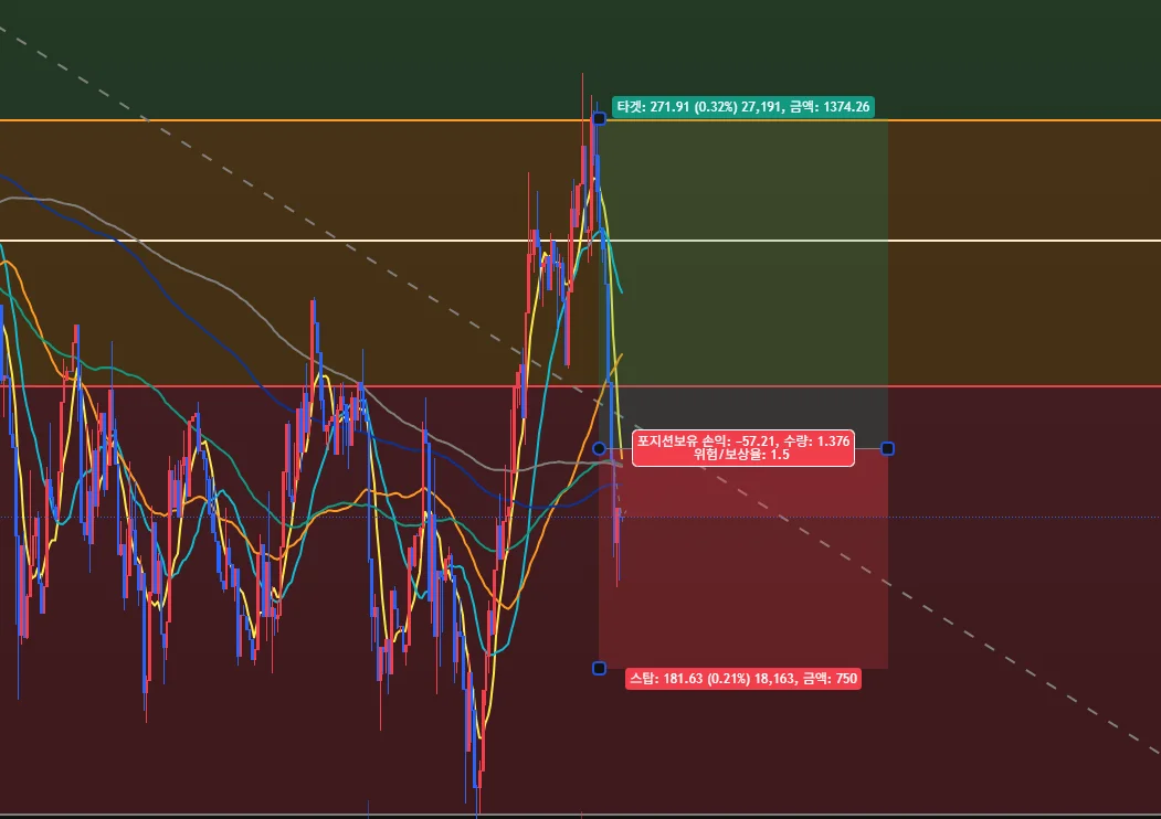 추세기반 피보나치 기준 0.236 아래로 내려온 후 아래 꼬리가 길게 달리는것 본 후 롱포지션 진입