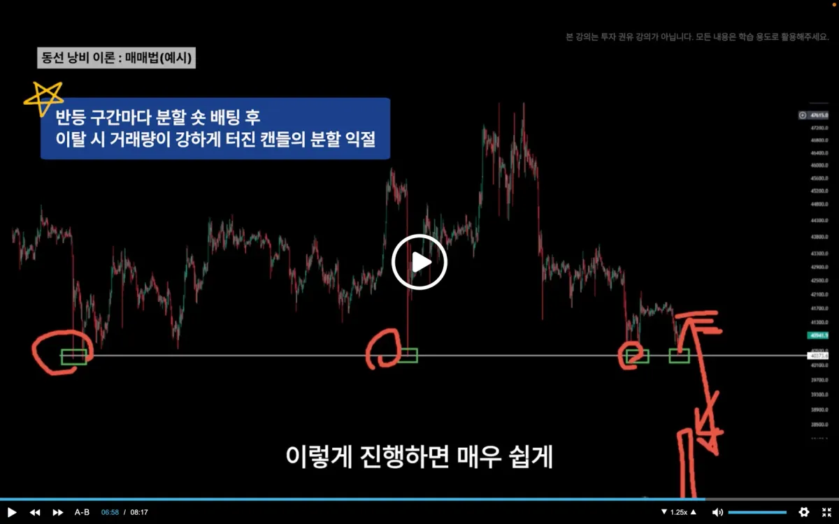가격이 지지선을 4번 정도 터치하고 나서 다시 올라올 때마다 짧은 반등이 나올 수 있으니, 이 반등마다 숏을 분할로 잡는 겁니다. 중요한 건 그 이후 지지선 이탈 시 강한 거래량과 함께 확실한 이탈 흐름이 나오는지를 체크하는 것이고요. 이탈이 확정적으로 보이는 경우, 그 다음 반등에서(즉, 지지선이었던 자리가 저항이 되는 자리에서) 물량을 추가하거나 본격적으로 승부를 보게 됩니다. 질문 주신 핵심 포인트를 나눠서 말씀드리자면, 지지선 이탈 이후 음봉이 나올 때마다 파는 방식인지, 아니면 긴 음봉이 나올 때 한꺼번에 파는 것인지 이 부분은 상황에 따라 달라질 수 있지만, 핵심은 구조를 먼저 확인한 다음, 분할 진입으로 리스크를 관리하면서 손익비가 좋은 자리를 노리는 겁니다. 즉, 처음에는 반등마다 분할 진입, 그리고 지지 이탈이 확정되는 시점에서 본진입 혹은 물량 추가가 들어갑니다. 긴 음봉이 터지는 흐름은 보통 이탈 후 나오는 경우가 많기 때문에, 그때는 추가 매도 진입이 가능하고요. 그 이전에는 손절을 짧게 잡고 진입하는 형태입니다. 고점과 고점을 연결한 추세선과 저점과 저점을 연결한 추세선을 상위 시간대에서 먼저 확인합니다. 여러 번 지지가 나왔던 자리에서 거래량이 터지며 이탈하면, 그 구간은 지지에서 저항으로 바뀐다고 보고 흐름을 관찰합니다. 이탈 전에는 반등마다 분할 숏 진입하고, 이탈 확정 이후에는 재반등 구간에서 본격 진입을 고려합니다. 이 내용을 가지고, 직접 상위 시간봉과 하위 시간봉을 함께 놓고 추세선과 지지선을 연결해서 작도해보시길 권장드립니다. 그래야 눈에 익고 몸에 익습니다.