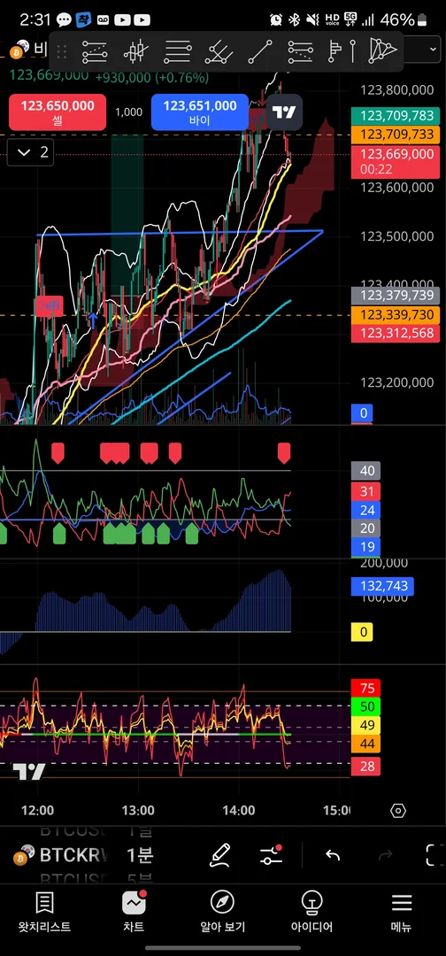 2. 정확한 타점을 잡기위해 1분봉을 봤고 삼각수렴이 그려졌으며 삼각수령 상승이탈. (실패)