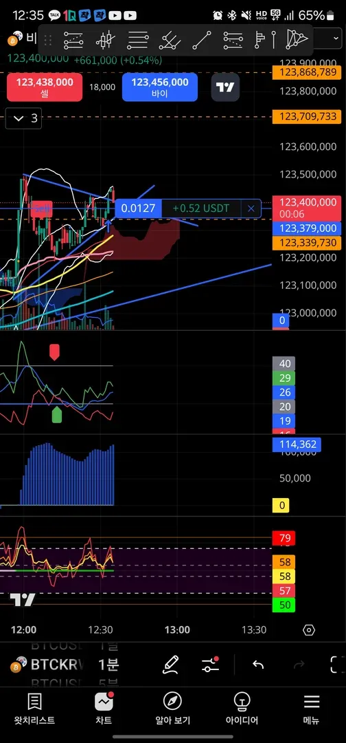 4. 1분, 5분봉상 어센딩 트라이앵글이 보임.