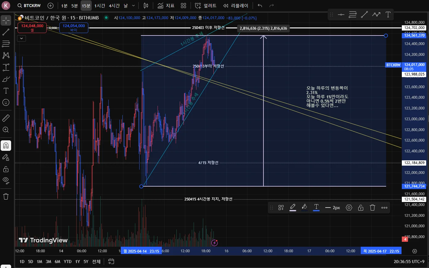 4/15 (화) 1일봉 -> 1시간 봉 -> > 15분봉 -> 5분봉 순으로 작도를 해봤습니다