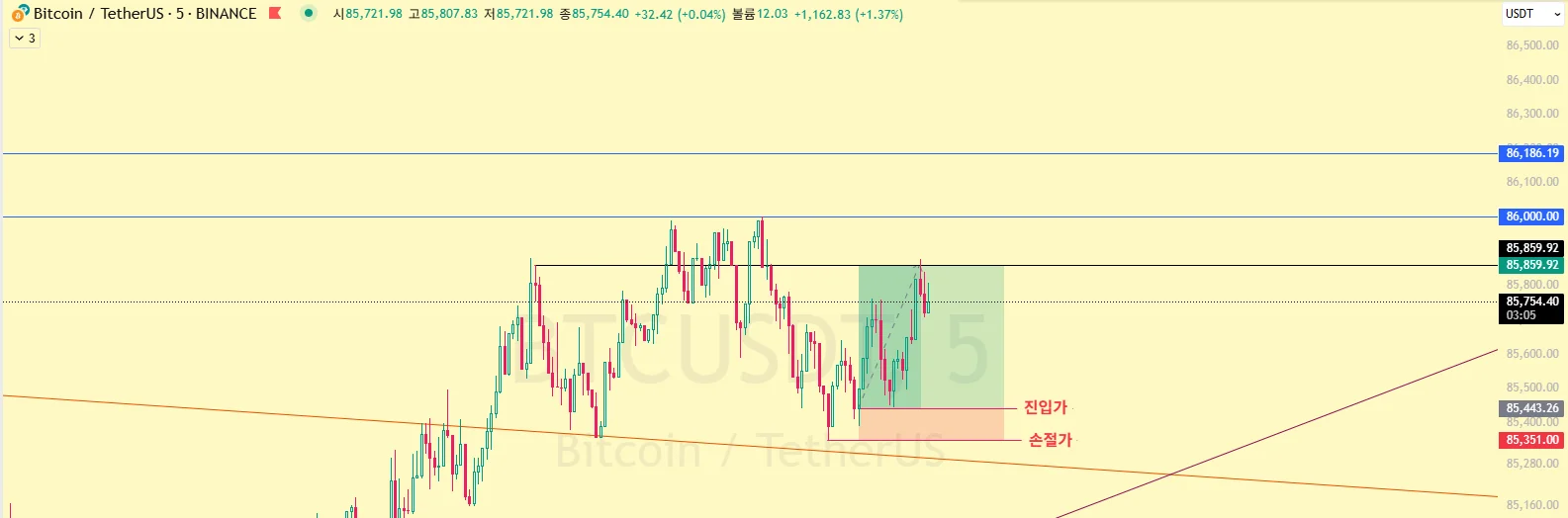86 저항선에서 누르는 힘이 강하다고 판단하여 ob구역 상단 라인에서 지지 받은 후 하락하는 것을 확인해 익절라인으로 잡았습니다.
