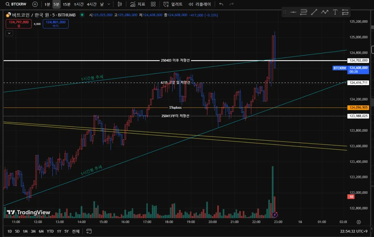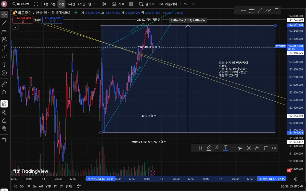4/15 (화) 1일봉 -> 1시간 봉 -> > 15분봉 -> 5분봉 순으로 작도를 해봤습니다