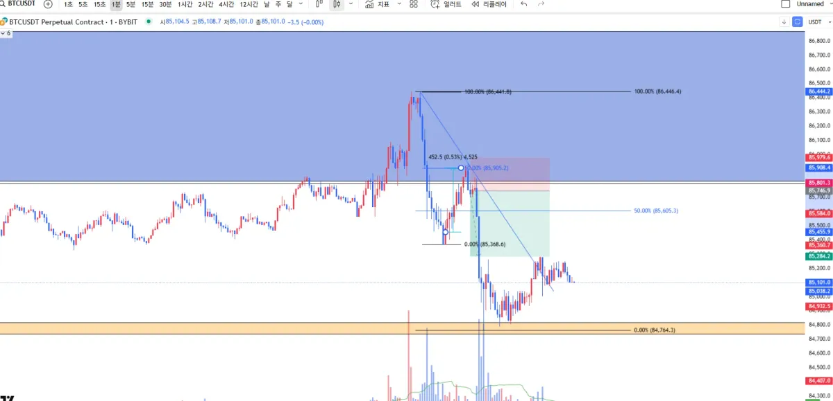 TP : 1:2 손익비인 85280 부근으로 생각해두었으나, 하단으로 더 빠지고 지지받는 캔들을 보고 익절했습니다. 좀 욕심을 부리긴 했네요.