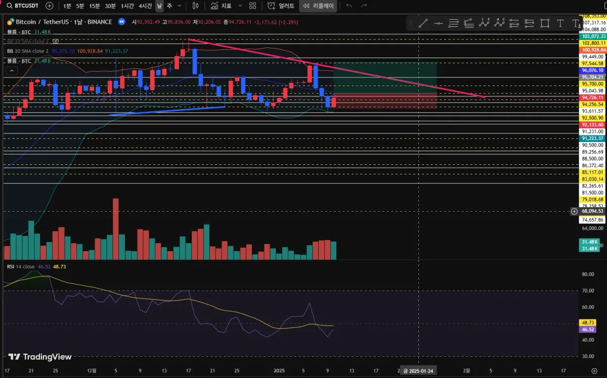 볼린저 밴드에서 저점에 닿았기 때문에 상승은 있을 것이라고 예상 + 빨간색으로 표시한 고점 추세선까지는 올라갈 것 + 볼린저 밴드가 상승할 라인으로 전환 중