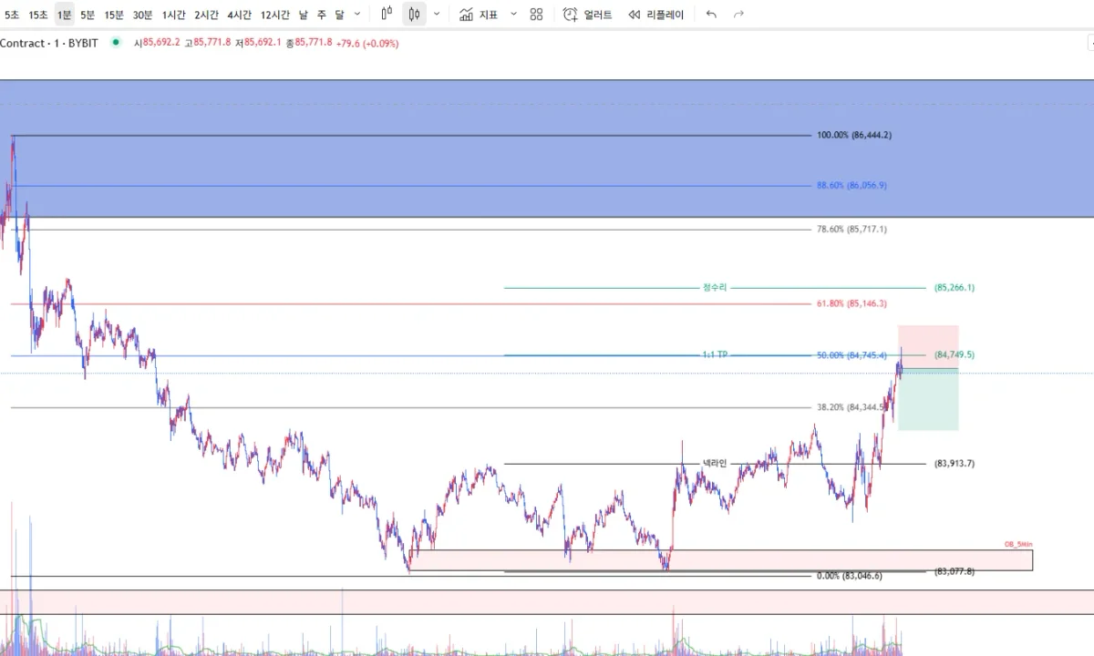 더블바텀의 1:1 TP 도달 및 하락의 50 명치 되돌림 겹치는 구간을 확인하고 숏 진입을 했습니다.