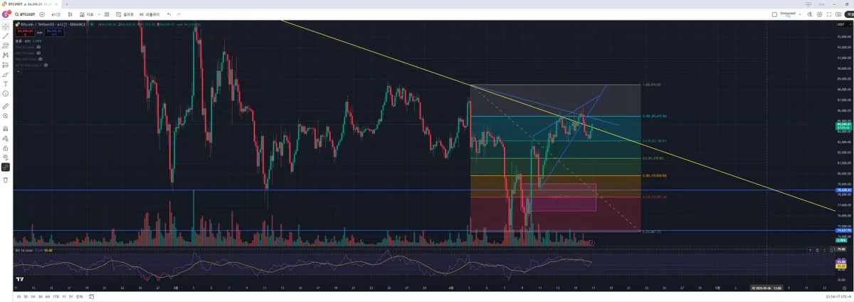 하락추세선 아래로 돌아왔기 때문에 손절라인은 직전고점인 86.4k 부근으로 설정해두었고 1차 tp구간을 83.2k로 설정해두었습니다.