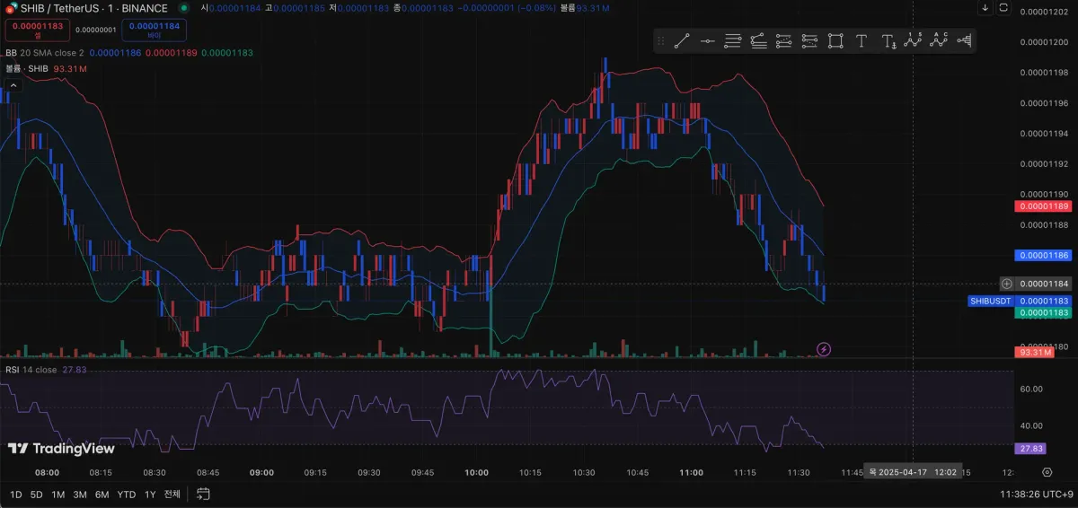 다행이 오늘 시바이누 코인이 1분봉에서 횡보+RSI 30% 이하 + 볼린저 밴드 하단 삼박자가 이루어져 빠르게 단타 해보았습니다.