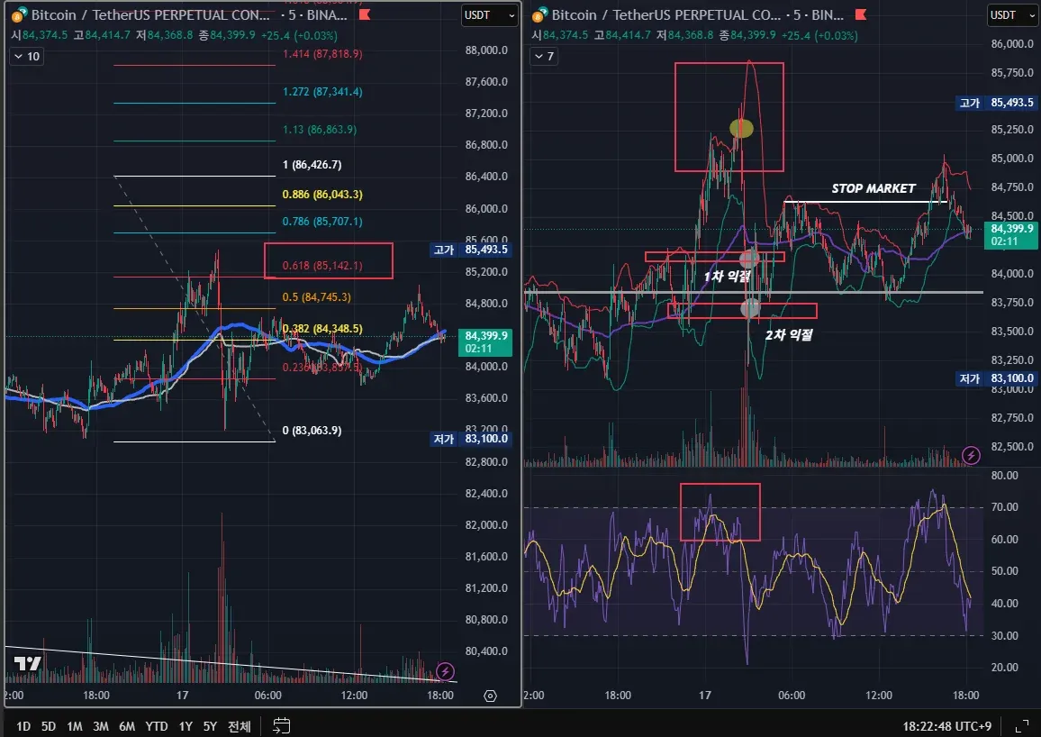 5분봉 하락 다이버전스까지 만들어주길래 숏진입해보았습니다. 운좋게 매물대로 보이는 구간에 반반식 익절하고