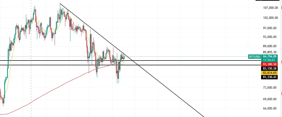 109K의 추세선과 83K 및 81K의 지지선을 작도하였습니다.