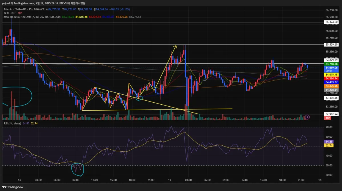 어제의 관점은 20이평선과 지지선 표시부에서 롱진입 노란추세선에서 손절잡고 두번째 저항선에서 반익, 세번째에서 완익의 시나리오