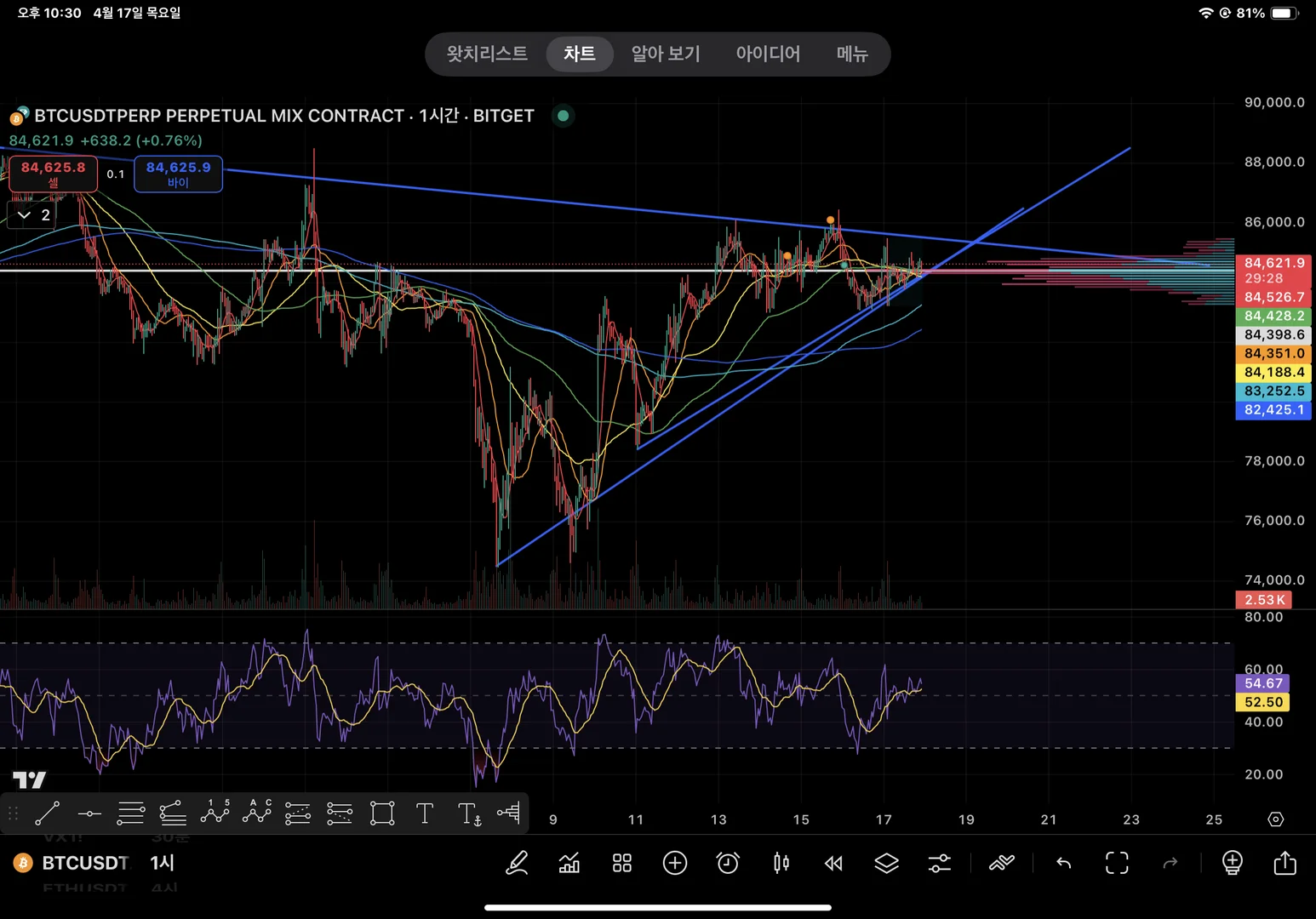 거래량과 RSI 지표는 모두 시장의 에너지 흐름을 보는 데 도움을 주는 보조지표이긴 하지만, 완전히 다른 성격의 지표이기 때문에 같은 방식으로 해석하면 안 됩니다. 먼저 거래량은 실제로 시장 참여자들이 얼마나 적극적으로 매수와 매도에 나섰는지를 보여주는 객관적인 수치 기반의 지표입니다. 예를 들어, 어떤 가격 구간에서 거래량이 급증했다면 그 자리는 중요한 지지 또는 저항으로 작용할 가능성이 높습니다. 특히 고점이나 저점에서 거래량이 터지면 해당 구간이 전환점이 될 수 있기 때문에 거래량은 구조적 분석에서 굉장히 중요합니다. 반면 RSI는 가격 변화의 속도와 방향성을 기반으로 한 모멘텀 지표입니다. RSI는 '상대적인 강도'를 수치화한 것이기 때문에 일정 기간 내에 얼마나 빠르게 가격이 올랐는지 또는 내렸는지를 보여줍니다. 그래서 RSI는 오히려 가격이 과하게 오르거나 내렸는지를 보여주는 심리적 과매수·과매도 상태를 파악하는 데 쓰이고, 거래량과는 계산 방식 자체가 다릅니다. 결론적으로 두 지표는 기반 데이터도 다르고 의미하는 바도 다르기 때문에 거의 비슷하게 움직인다고 보기는 어렵습니다. 다만, RSI가 과매도 구간에 있는데 그 타이밍에 거래량도 급감하고 있다면, 시장 참여자들이 에너지를 아끼고 있는 상황에서 바닥 다지기를 하고 있을 가능성 정도는 함께 고려할 수 있습니다. 지금 올려주신 차트에서도 거래량은 점점 줄어드는 수렴 구간에 들어가 있고, RSI는 고점과 저점이 점차 낮아지는 모습인데, 이는 아직까지는 추세가 명확히 전환되지 않았음을 의미합니다. 이럴 때는 가격의 수렴이 끝나고 거래량이 동반된 방향 이탈이 나오는지를 집중해서 보면 됩니다.