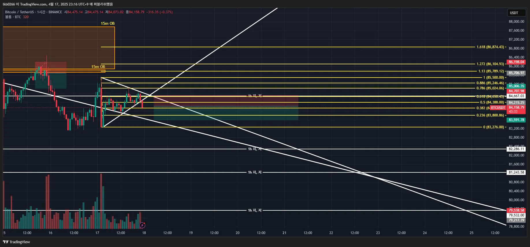 1차: 83,350 더블탑패턴 1:1TP (큰 하락 이후 지지 받았던 구간