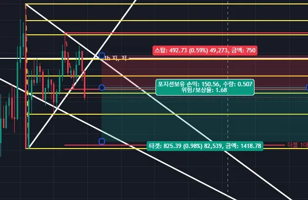 1차: 83,350 더블탑패턴 1:1TP (큰 하락 이후 지지 받았던 구간