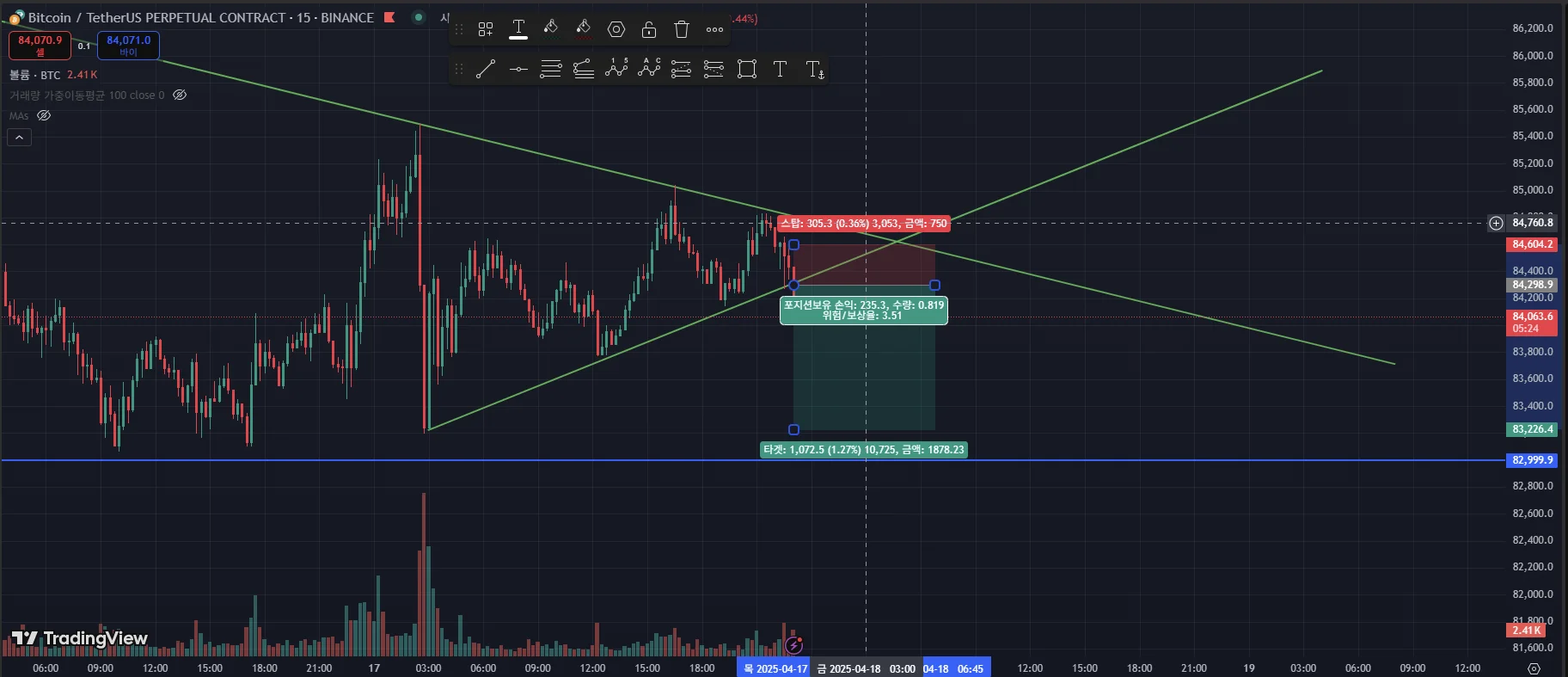 작성자비트코인 현물 15분봉 차트입니다. 상승 추세선과 하락 추세선을 그려 보았더니 삼각수렴을 작도할 수 있었고, 만약 제가 가진 관점으로 진입한다면 삼각수렴 이탈에 따른 숏포지션으로 들어갔을 것 같습니다. 익절은 전 저점이 저항선이 될 수 있을 것 같다고 생각하여 83200정도로 잡고, 손절은 삼각수렴 이탈이 기준이었으므로 삼각수렴 안으로 들어올 때 손절을 하는 시나리오를 그려보았습니다.