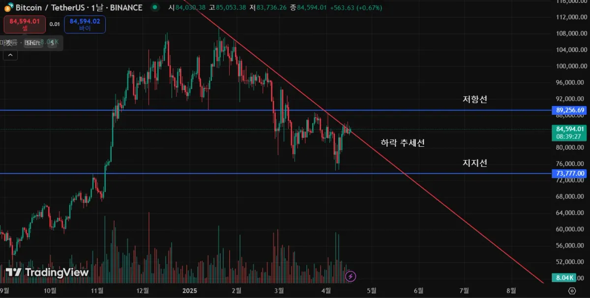 장기적인 관점에서 지지선, 저항선, 하락추세선을 그려보았습니다.