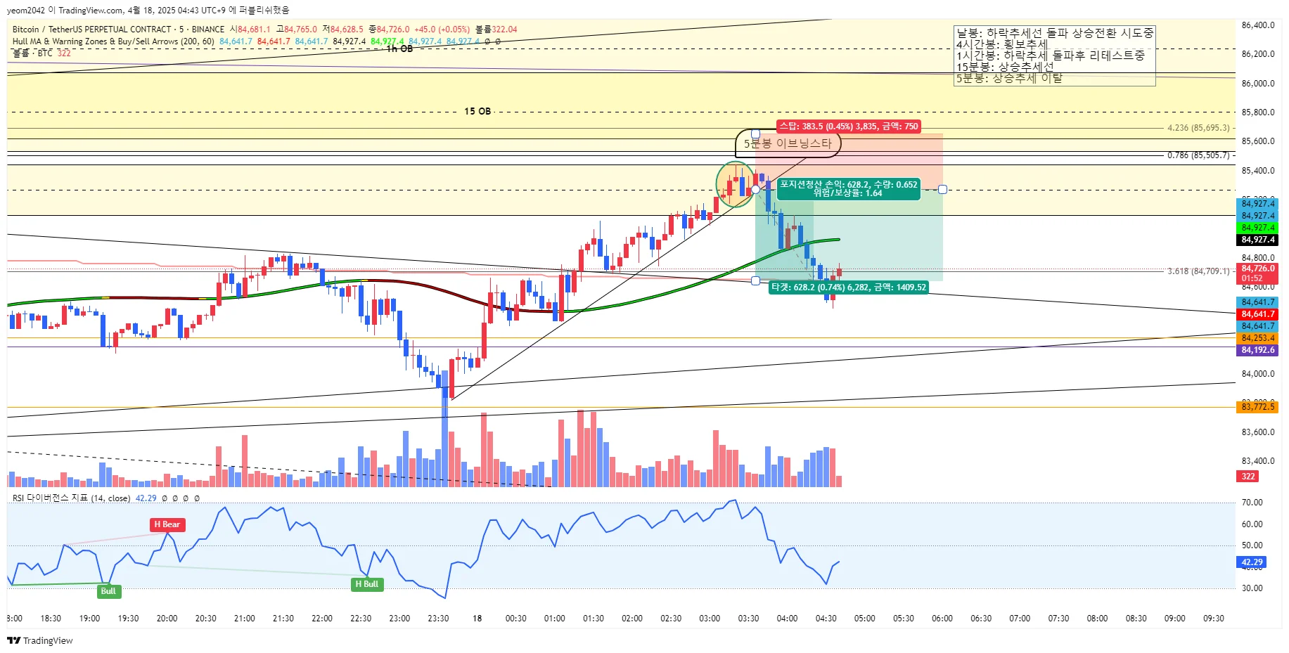 85k에 있는 15분봉 OB 상단에 5분과 15분봉에서 이브닝스타 캔들이 보이는것같아서 숏 진입.