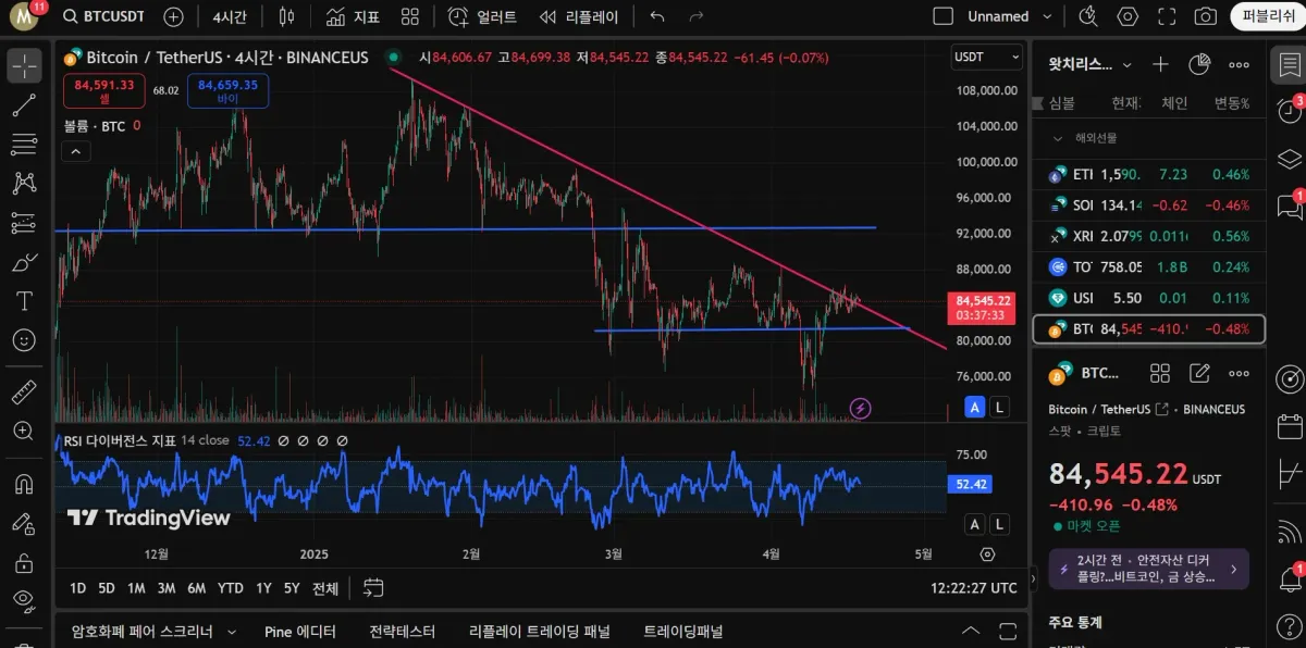 92.7k 4시간봉 상다 여러차례 발생했던 지지영역이지만 뚫리고 나서는 저항역할을 하고 있습니다. 81.7k 역시 여러차례 지지해주며 4시간봉 상다를 만들어주었지만 결국은 뚫리고 신저점을 형성했습니다.