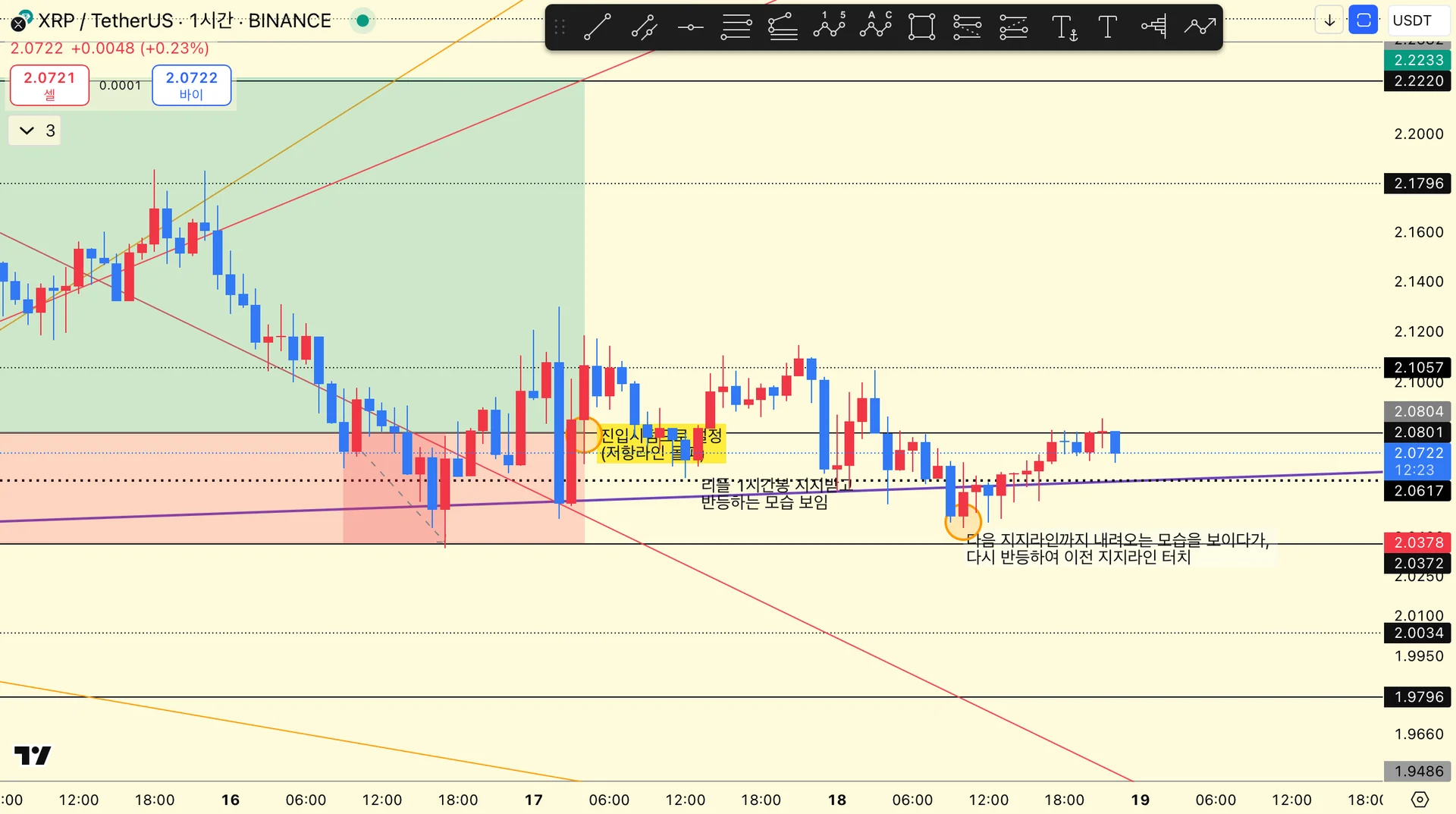 눈여겨보던 리플 차트를 일봉, 4시간봉, 1시간봉으로 정리하여 포지션을 잡고 현재 홀딩 중에있습니다.