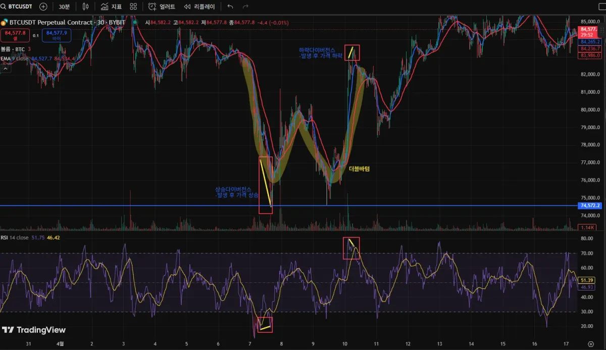 현재 차트에 대한 피드백 지금 차트에서는 상승 다이버전스 이후 더블바텀 패턴이 명확하게 나타났고, 이후 상승으로 이어졌습니다. 이건 구조와 시그널이 일치한 좋은 사례입니다. 반대로 하락 다이버전스 이후 고점 갱신 실패 및 하락이 이어진 부분도 깔끔하게 잘 캐치하셨습니다. 다만 RSI의 다이버전스는 항상 시간 프레임 별로도 다르게 나타날 수 있기 때문에, 가능하다면 상위 시간봉(1시간, 4시간 등)에서의 RSI 흐름도 같이 비교해보시길 권장합니다. 상위 시간봉에서 같은 방향의 다이버전스가 확인되면 신뢰도는 훨씬 올라갑니다. RSI 다이버전스는 반전의 가능성을 보여주는 시그널일 뿐, 구조적 패턴이나 거래량, 지지 저항 반응까지 확인돼야 실전 진입 근거로 삼을 수 있습니다. 다이버전스는 반드시 추가적인 확인 신호와 함께 쓰는 습관을 들이셔야합니다!