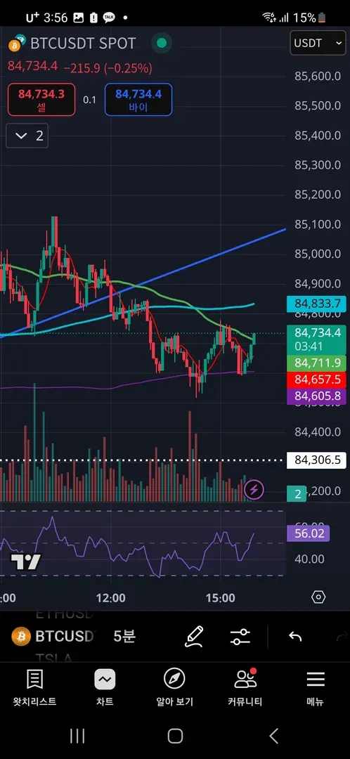 5분봉 하락추세에서 400일 이평선을 지지로 상승추세로 전환될때 진입에서 전고점에 팔았습니다