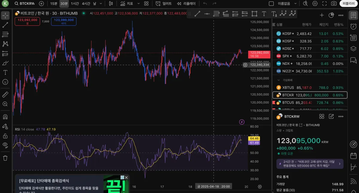 트레이딩 뷰를 사용하여서 RSI 지표를 추가해봤습니다.