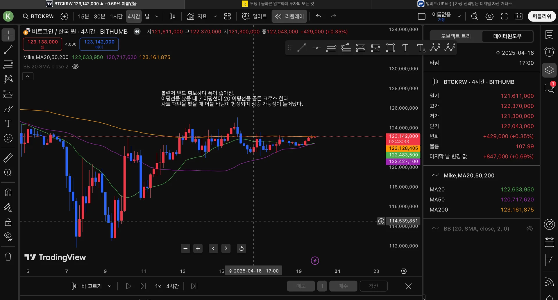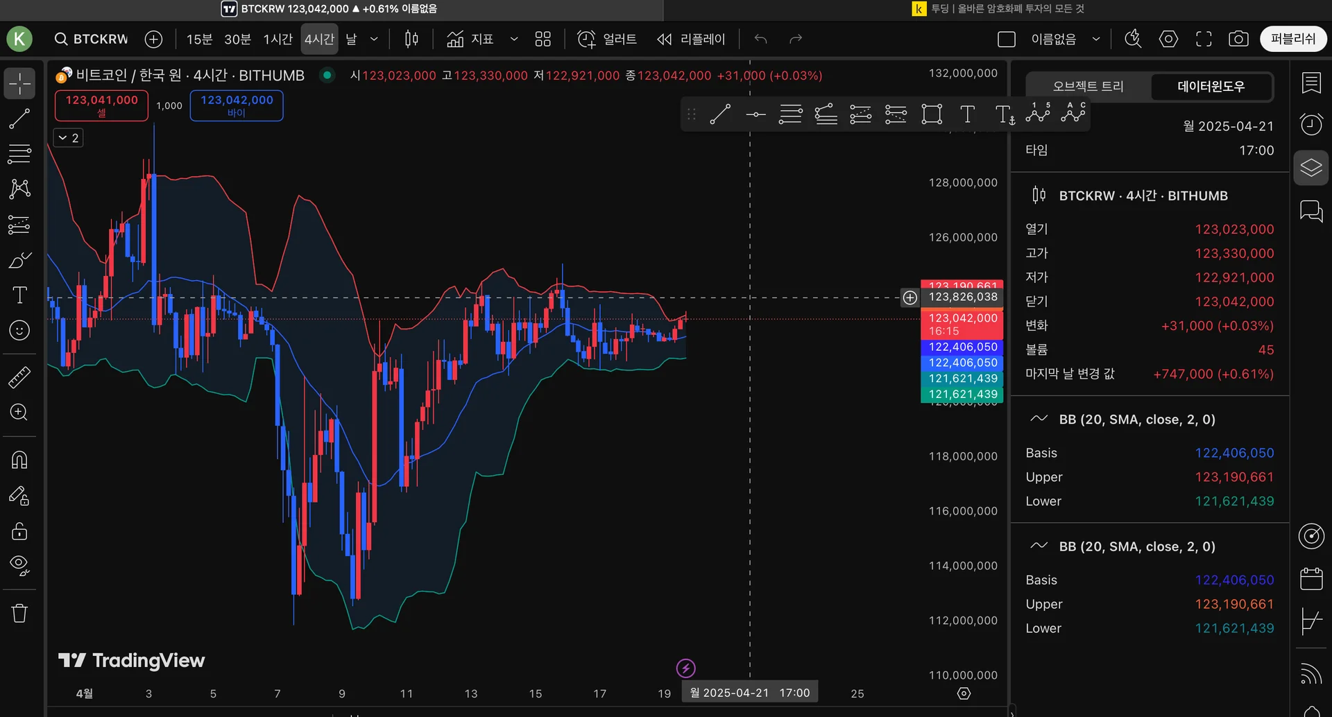 현재(2025.04.19 비트코인 4시간 봉 기준) 차트 패턴이 더블 바텀이고 볼린저 밴드의 폭이 점점 좁아지며 횡보 중에 있습니다.