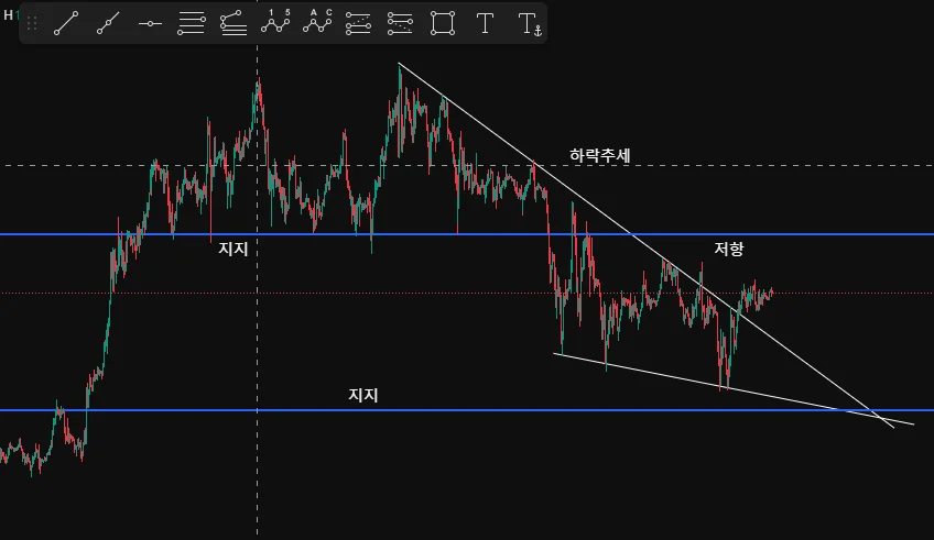하락추세선을 다시 깨고 내려갈지 또는 추세선을 지지로 올라갈지는 지켜봐야될 것 같습니다.