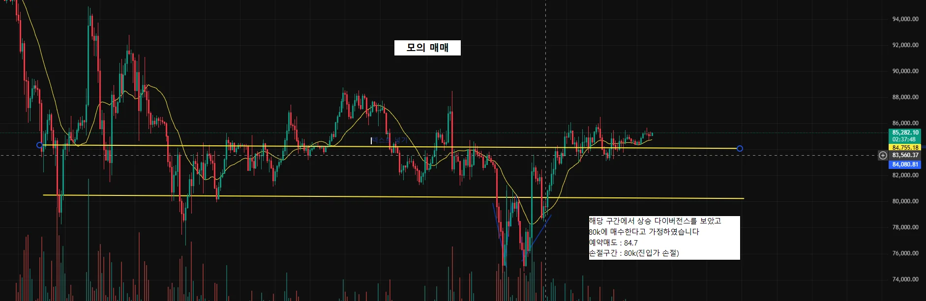 캡쳐본에서 보다시피 상승 다이버전스로 판단하였고 추세또한 상승전환으로 판단하여 매물대인 80k를 뚫는다면 그 다음 매물대까지 올라오겠다는 판단을하여