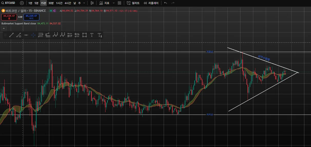 작성자비트코인 15분봉 삼각수렴중으로 금일 오후에 이탈이 상방 또는 하방으로 발생할 것으로 보입니다. 거래량도 부족하고 매크로 환경이 불안정하여, 하방이탈할 것으로 조심스럽게 예측해 봅니다.