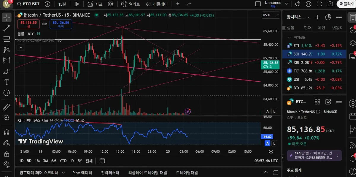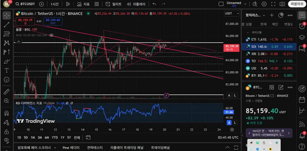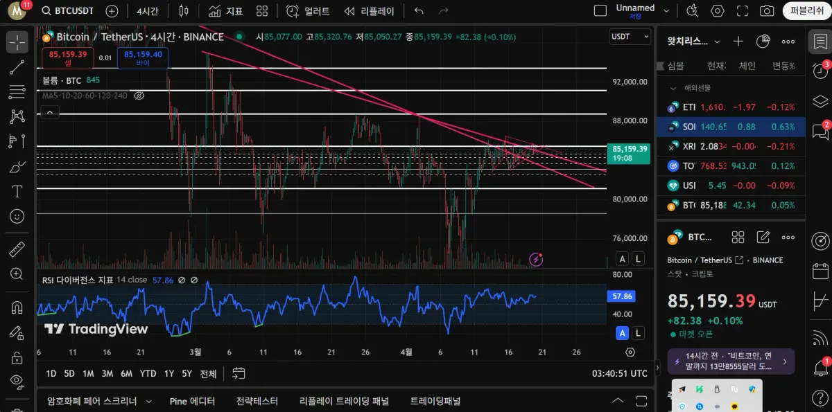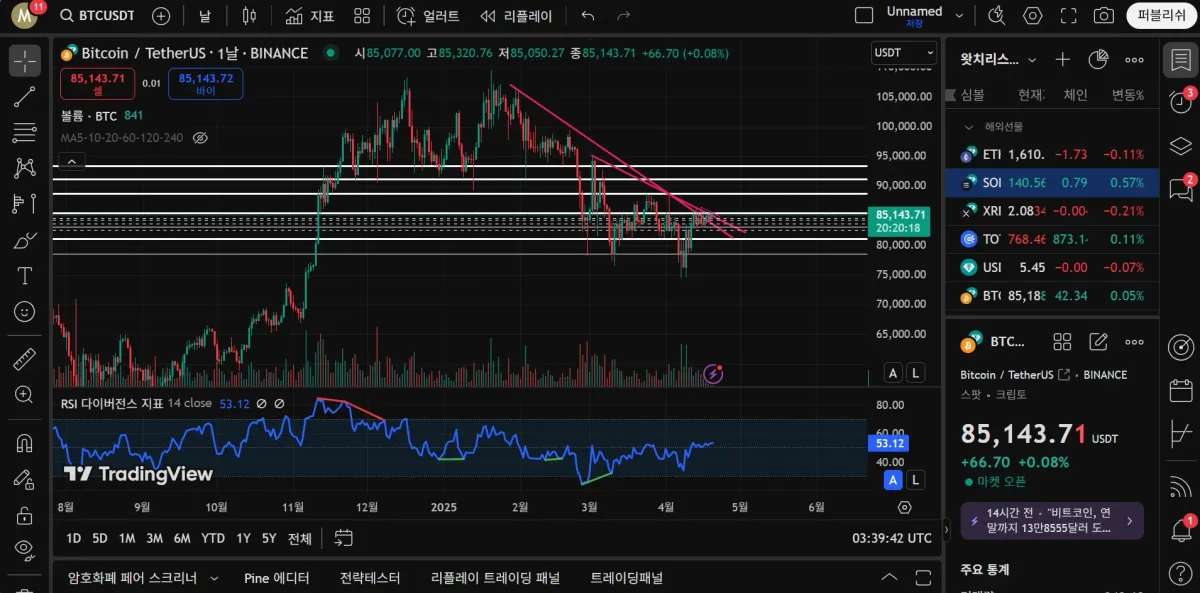 우선 위에서부터 93.2 k 91.3 k (4시간 상승 다이버전스), 88.7k ( 강력한 저항구간 ) 85.6 k (최근 여러번 저항에 86.6까지 잠깐 넘었으나 자시 저항받고 있음), 81.2 k (4시간 상승다이버전스, 강력한 지지였으나 돌파된후 저항 역할도 했었음), 78.6k (저점 갱신후 한번 지지받고 오른 지점) 하락 추세선은 3번의 실패후 현재 돌파후 테스트중인 것으로 보입니다. 1시간 봉 차트에서 현재는 85.6k 저항으로 상승하다가 한단계씩 내려와 다시 올라가는 형태를 보이고 있습니다. 크게 보면 계속된 횡보의 모습입니다.