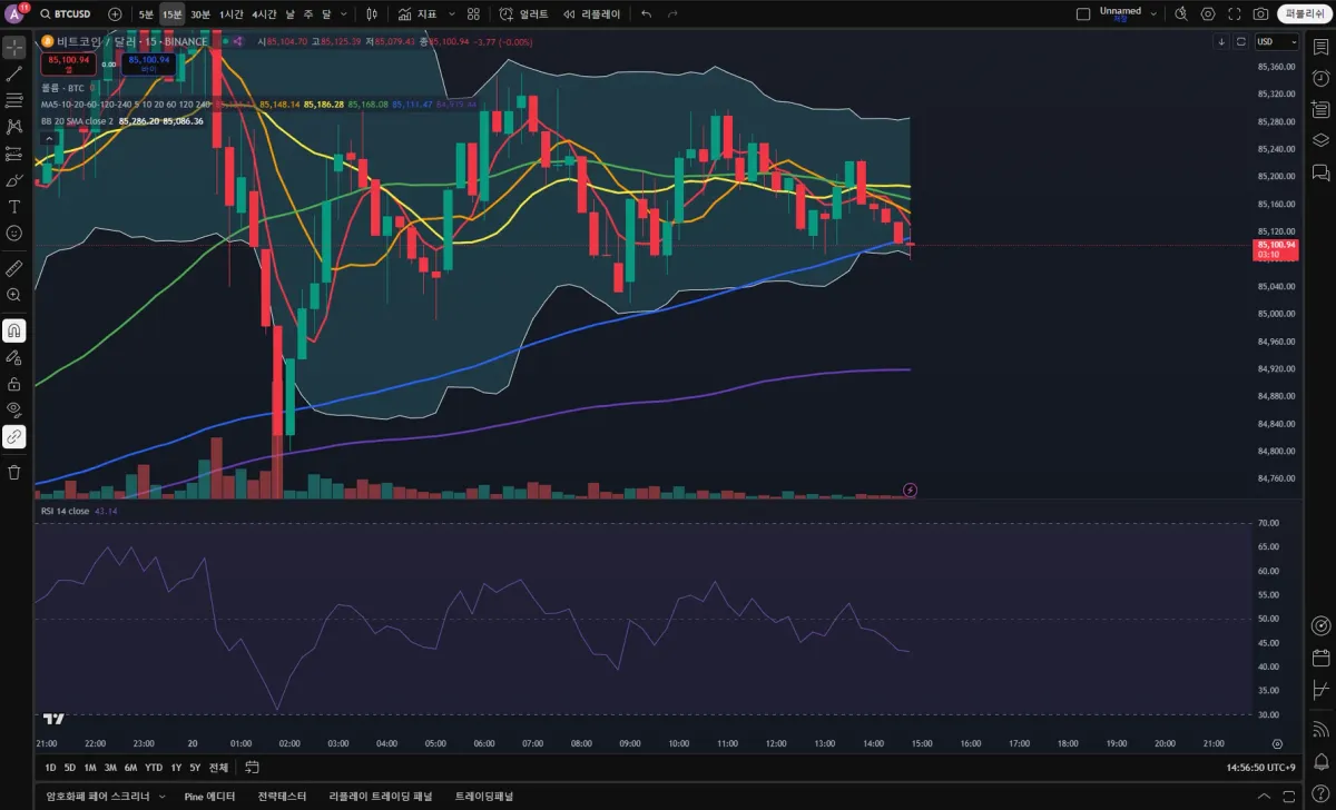 85364에 매도 진입, 86000에 도달 시 2차 매도 진입, 전 고점 86500을 돌파 시 손절. 240일선에 도달하거나 월요일 새벽까지 하락 움직임이 보이지 않을 시 수익실현 or 상승 시 손절 대응입니다.