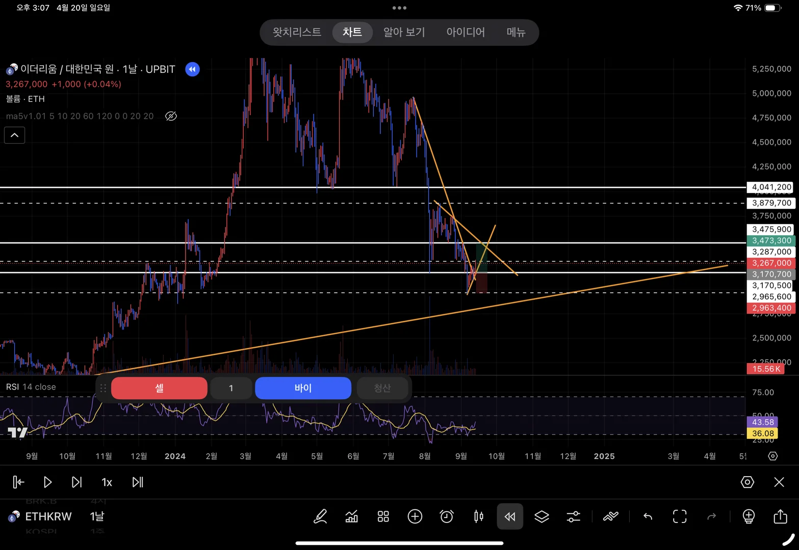4) 이후 재생 결과 상승 추세선을 이탈하여 잠시 걱정을 하였지만 쌍바닥 패턴을 보이면서 상승 익절을 하였습니다.