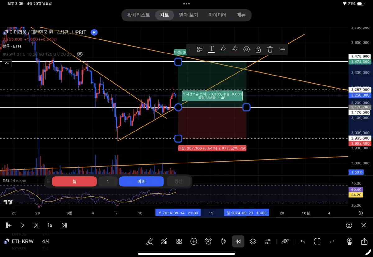 1) 이더리움krw 차트를 이용 24년 9월의 일봉상 모의 트레이딩을 진행했습니다.