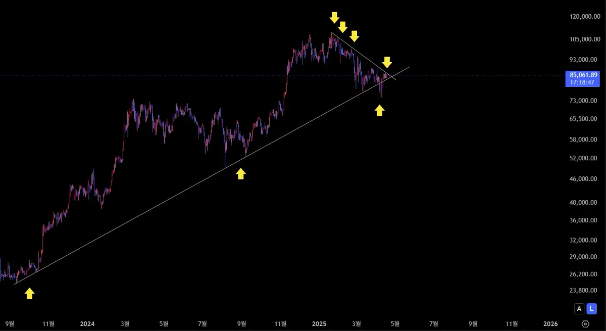 1. 상승추세선은 장기선이고, 하락추세선은 단기선으로 보고있습니다.